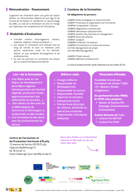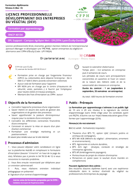 La Licence professionnelle Développement des entreprises du végétal permet d’acquérir les méthodes et les connaissances approfondies nécessaires au développement des activités et à la direction des entreprises du secteur végétal.