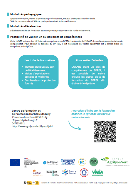 Cette UCARE est une des UC (blocs de compétence) du BPREA. La réussite de l’UCARE donne lieu à une attestation de compétences. Pour obtenir le diplôme du BP REA, il est nécessaire de valider également les 6 autres blocs de compétence du diplôme. BP Responsable d’entreprise agricole (formation continue)