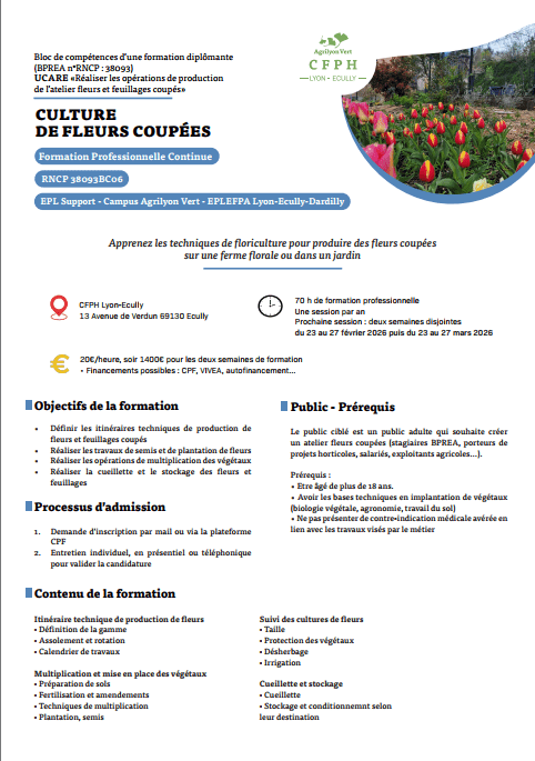 Le public ciblé est un public adulte qui souhaite créer un atelier fleurs coupées (stagiaires BPREA, porteurs de projets horticoles, salariés, exploitants agricoles…)